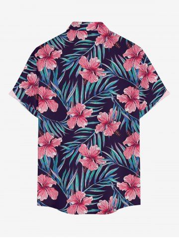 Chemise à Manches Courts> Chemise à poches boutons grande taille pour homme, imprimée de fleurs d'hibiscus et de feuilles tropicales, style hawaïen.