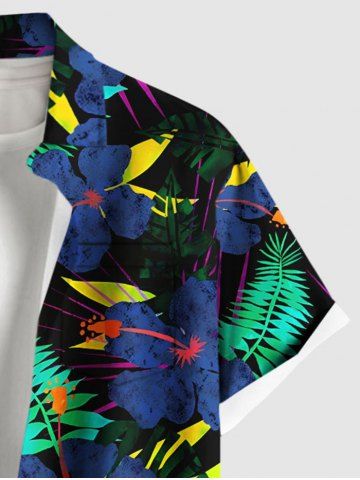 Chemise à Manches Courts> Chemise à poches boutons grande taille pour homme, imprimée de fleurs d'hibiscus et de feuilles tropicales, style hawaïen.