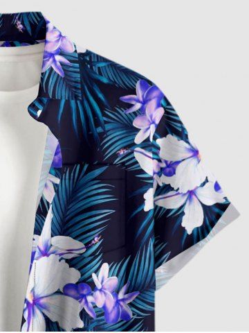 Chemise à Manches Courts> Chemise à poches boutons grande taille pour homme, imprimée de fleurs d'hibiscus et de feuilles tropicales, style hawaïen.