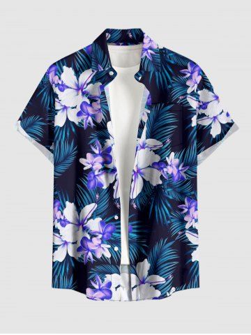 Chemise à Manches Courts> Chemise à poches boutons grande taille pour homme, imprimée de fleurs d'hibiscus et de feuilles tropicales, style hawaïen.