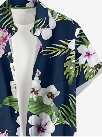 Chemise à Manches Courts> Chemise à poches boutons grande taille pour homme, imprimée de fleurs d'hibiscus et de feuilles tropicales, style hawaïen.