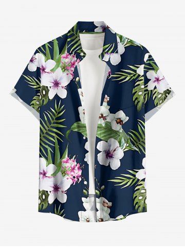 Chemise à Manches Courts> Chemise à poches boutons grande taille pour homme, imprimée de fleurs d'hibiscus et de feuilles tropicales, style hawaïen.
