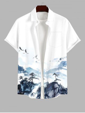 Men's Ink Painting Mountain Crane Pine Tree Print Buttons Pocket Shirt