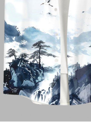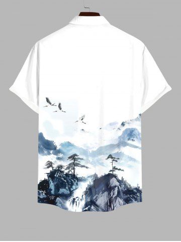 Men's Ink Painting Mountain Crane Pine Tree Print Buttons Pocket Shirt
