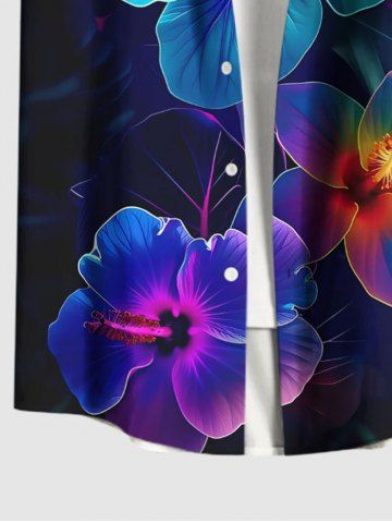 Chemise D'Hibiscus Colorée Fleur Tropicale Imprimée de Grande Taille avec Poche - Noir - Noir