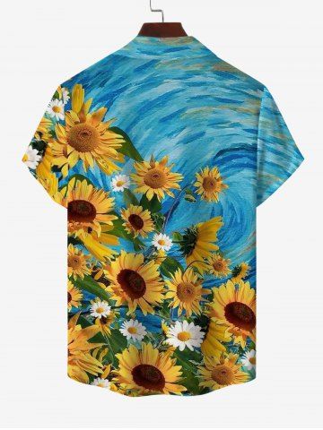 Chemise Décontractée avec Pochette à Col Rabattu à Imprimé Tournesols et Marguerites Grande-Taille pour Hommes - Bleu - Bleu