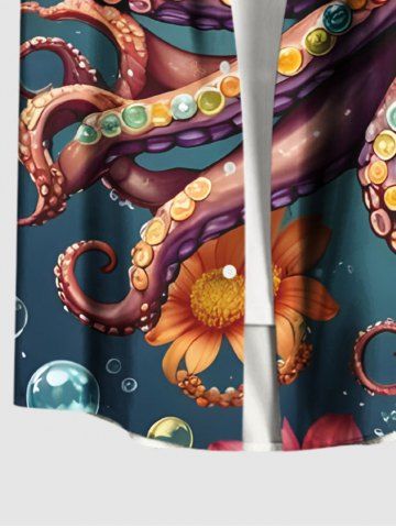 Chemise à Manches Courts> Chemise hawaïenne grande taille à imprimé fleurs de poulpe et bulles, boutonnée et ombrée, avec poches, pour homme