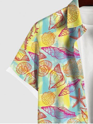 Chemise à Manches Courts> Chemise Décontractée en Blocs de Couleurs Etoile de Mer Coquille et Conque Imprimés avec Poche de Grande Taille pour Homme