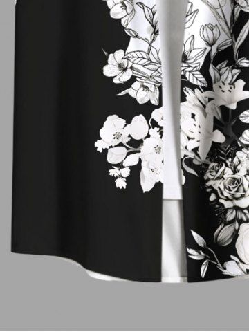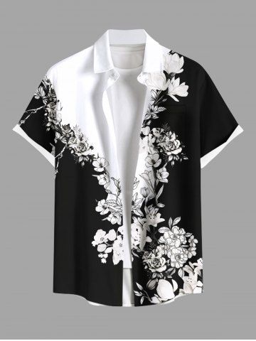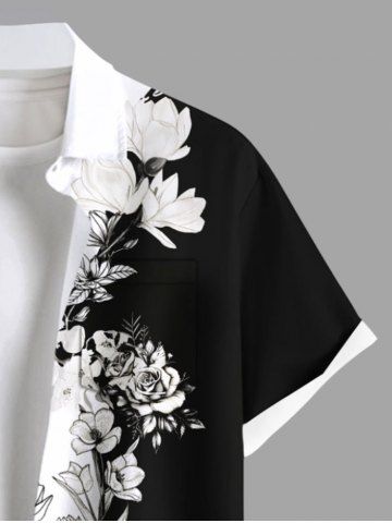 Chemise Décontractée en Blocs de Couleurs Fleur Feuille Imprimées avec Poche de Grande Taille - Noir - Noir