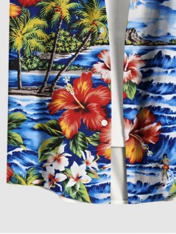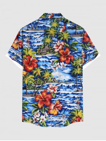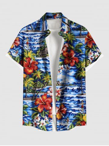 Chemise Décontractée Fleur D'Hibiscus et Arbre Noix de Coco Imprimés de Grande Taille avec Poche - Bleu Ciel - Bleu Ciel