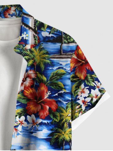 Chemise à Manches Courts> Chemise Décontractée Fleur D'Hibiscus et Arbre Noix de Coco Imprimés de Grande Taille avec Poche