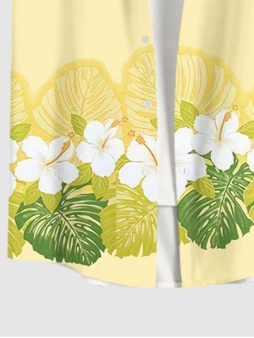 Chemise Décontractée Fleur Feuille D'Hibiscus et Feuille Tropicale Imprimées de Grande Taille avec Poche - Jaune - Jaune