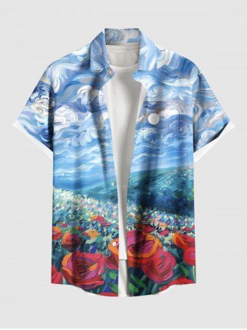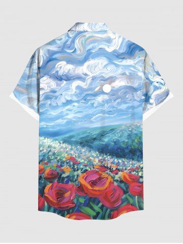 Chemise à Manches Courts> Chemise Décontractée Peinture Rose Fleur et Nuage Imprimées avec Poche de Grande Taille pour Homme