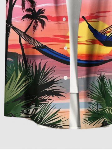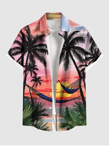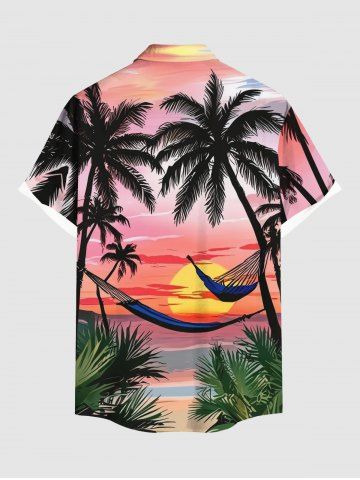 Chemise à Manches Courts> Chemise Décontractée Tordue Soleil et Arbre de Noix de Coco Imprimés avec Poche de Grande Taille pour Homme