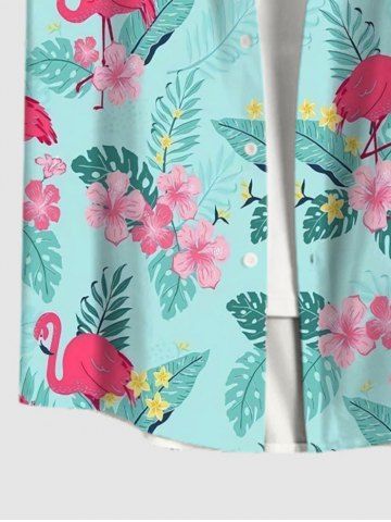 Chemise Fleurie Feuille Arbre Noix de Coco et Flamant Imprimés de Grande Taille avec Poche - Vert Clair - Vert Clair