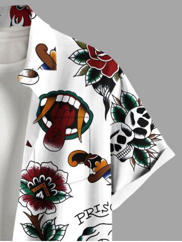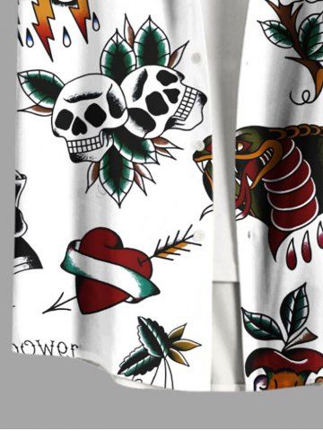 Chemise grande taille à imprimé tête de mort, fleur, cœur, œil de serpent, boutonnée et poche pour homme - Blanc - Blanc