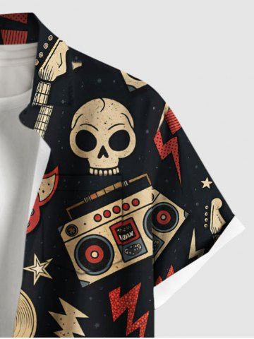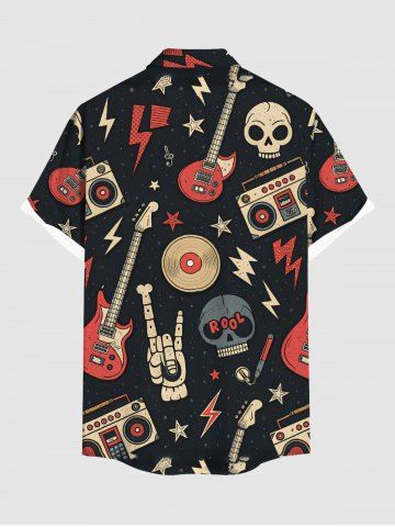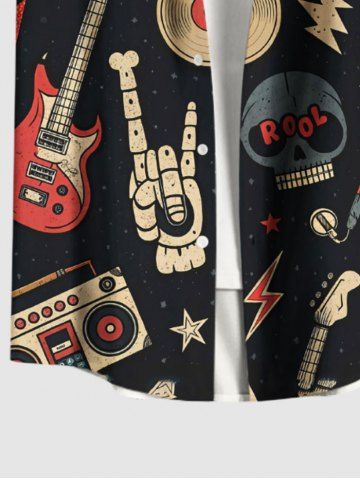 Chemise grande taille à imprimé tête de mort, guitare, radio, rock and roll hawaïen, boutonnée et poche pour homme - Noir - Noir