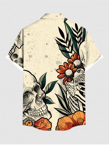 Chemise à Manches Courts> Chemise grande taille pour homme, motif tête de mort, squelette, fleurs, feuilles, boutons, poche, imprimé Halloween