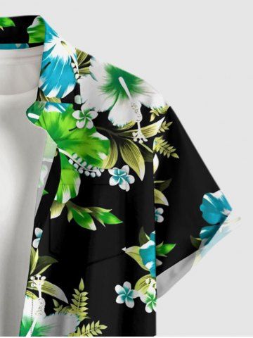 Chemise hawaïenne à imprimé de fleurs d'hibiscus et de feuilles, grande taille, avec poche boutonnée, pour homme - Noir - Noir