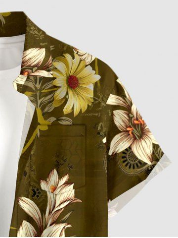 Chemise à Manches Courts> Chemise hawaïenne à imprimé floral, feuilles et branches, grande taille, avec poche boutonnée, pour hommes