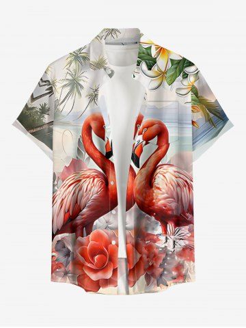 Chemise à Manches Courts> Chemise hawaïenne à poches boutonnées, imprimé cocotier, fleur de mer et flamant rose, grande taille, pour hommes