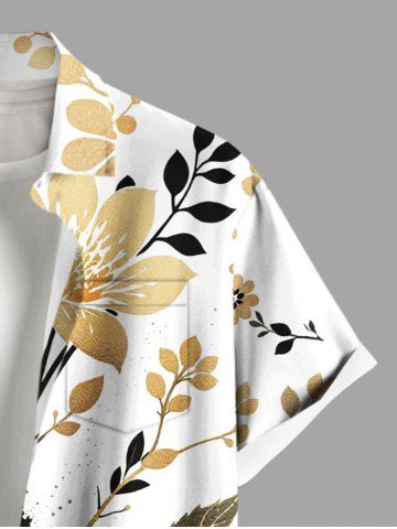 Chemise à Manches Courts> Chemise hawaïenne à poches boutons, imprimé contrasté de fleurs, feuilles et branches, grande taille, pour hommes