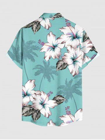 Chemise hawaïenne à poches boutons, imprimé feuilles et fleurs de cocotier et d'hibiscus, grandes tailles pour hommes - Turquoise Foncée - 5xl