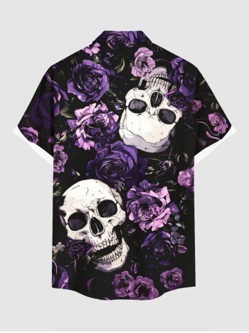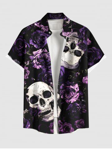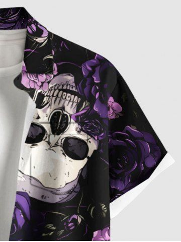 Chemise à Manches Courts> Chemise hawaïenne grande taille à boutons et poches, imprimé tête de mort et roses, pour homme