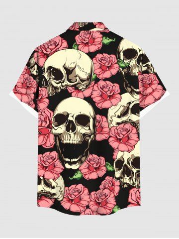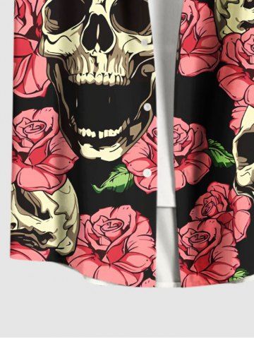 Chemise hawaïenne grande taille à boutons et poches pour homme, imprimé tête de mort, roses et fleurs - Noir - Noir