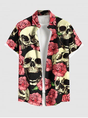 Chemise hawaïenne grande taille à boutons et poches pour homme, imprimé tête de mort, roses et fleurs - Noir - Noir