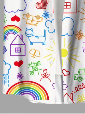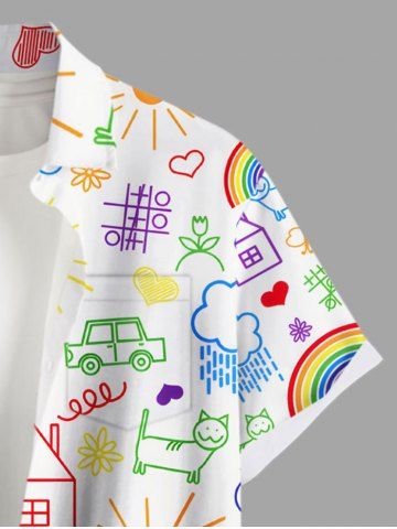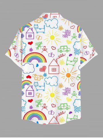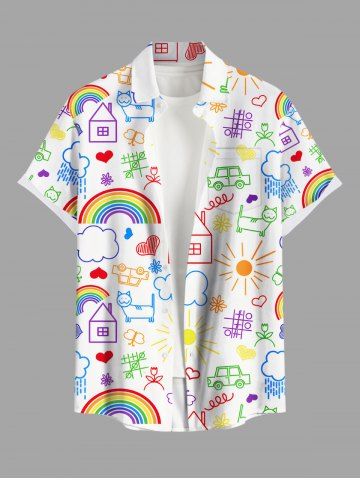 Chemise hawaïenne grande taille à imprimé arc-en-ciel, maison, soleil, nuage, fleurs, bonhomme allumette, boutons, poche, pour homme - Blanc - Blanc