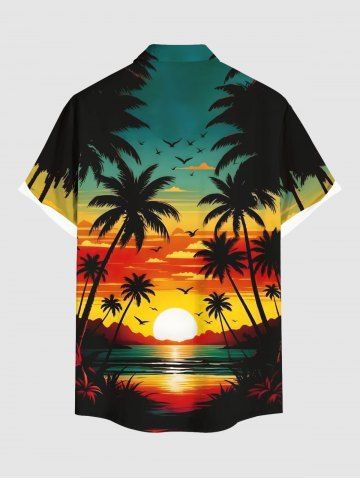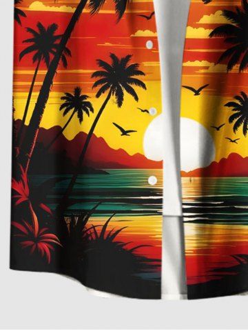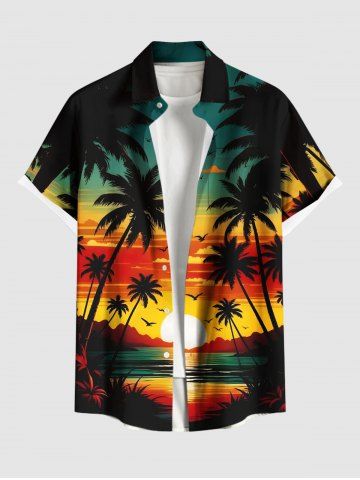 Chemise à Manches Courts> Chemise hawaïenne grande taille à imprimé cocotier, soleil, oiseau, paysage marin, nuages, boutons, poche, pour homme