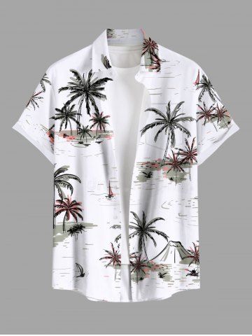Chemise hawaïenne grande taille à imprimé cocotier, voilier, vagues de la mer, boutons et poches pour homme - Blanc - Blanc