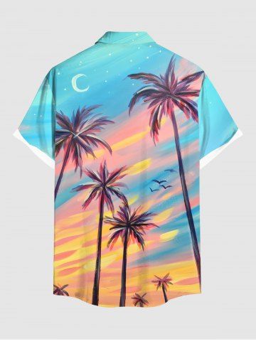 Chemise hawaïenne grande taille à imprimé cocotiers, ciel coloré, lune, étoiles, boutons et poches pour homme - Bleu Clair - Bleu Clair