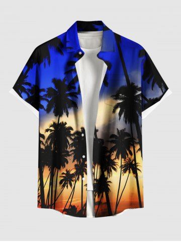 Chemise hawaïenne grande taille à imprimé cocotiers et crépuscule ombré pour homme - Bleu Profond - 3xl