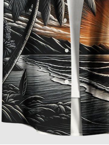 Chemise à Manches Courts> Chemise hawaïenne grande taille à imprimé cocotiers, soleil et paysage marin, boutons et poches pour homme