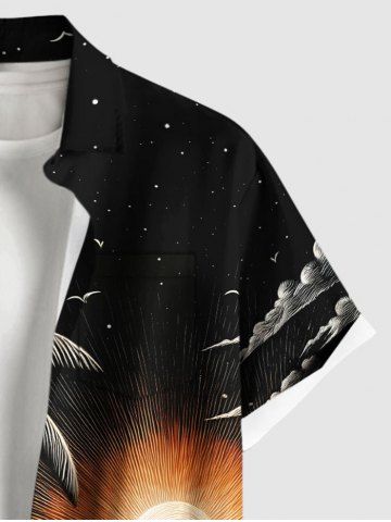 Chemise hawaïenne grande taille à imprimé cocotiers, soleil et paysage marin, boutons et poches pour homme - Noir - Noir