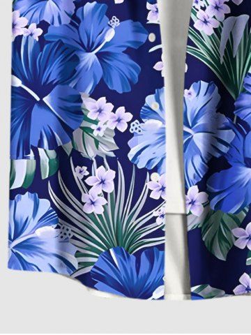 Chemise hawaïenne grande taille à imprimé feuilles d'hibiscus et boutons avec poches pour homme - Bleu Ciel - Bleu Ciel