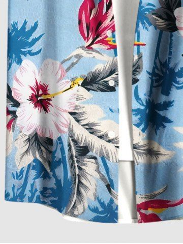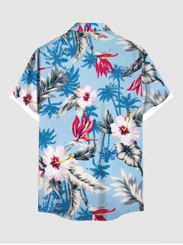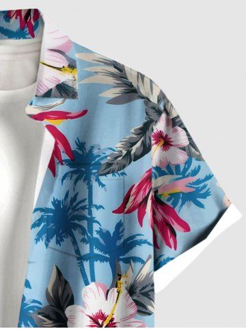 Chemise hawaïenne grande taille à imprimé fleurs d'hibiscus, feuilles de cocotier, boutons et poches pour homme - Bleu Clair - Bleu Clair