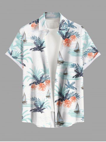 Chemise hawaïenne grande taille à imprimé fleurs d'hibiscus, feuilles tropicales, voilier, boutons et poches pour homme - Blanc - Blanc