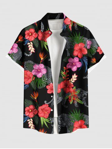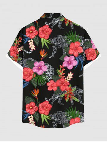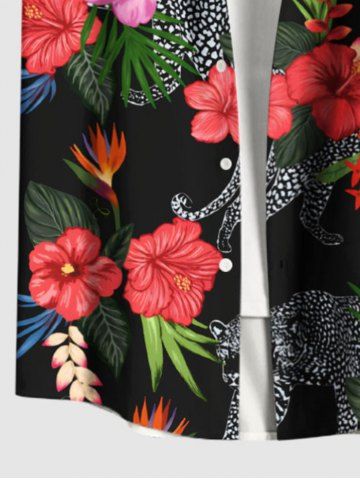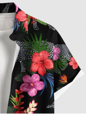 Chemise hawaïenne grande taille à imprimé léopard et feuilles tropicales, hibiscus et fleurs, avec poches boutonnées pour homme - Noir - Noir