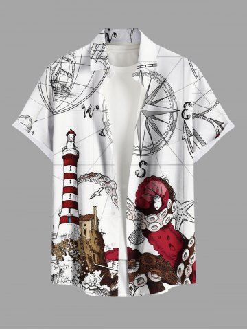 Chemise hawaïenne grande taille à imprimé poulpe, étoile de mer, phare, vagues, navire, gouvernail, croisière, boutons, poche, pour homme - Blanc - Blanc