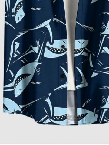 Chemise hawaïenne grande taille à imprimé requins, boutons et poches pour hommes - Bleu Profond - 5xl