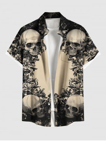 Chemise à Manches Courts> Chemise hawaïenne grande taille à imprimé tête de mort et fleurs, avec poches et boutons, pour homme