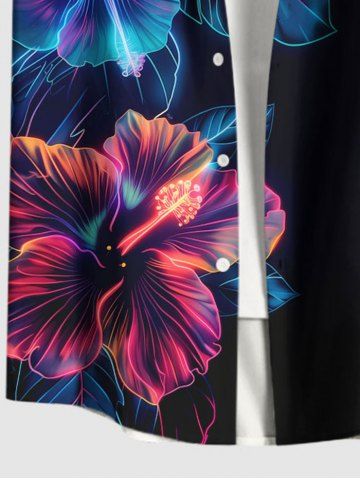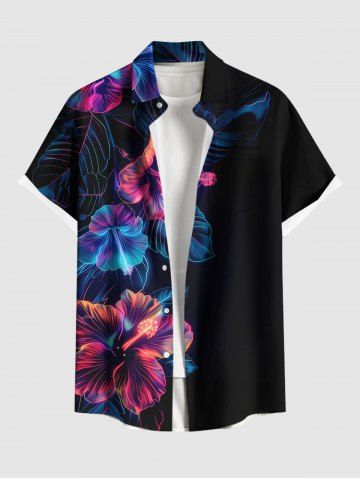 Chemise hawaïenne grande taille à imprimé tropical, fleurs d'hibiscus et feuilles, avec poches et boutons, pour homme - Noir - Noir