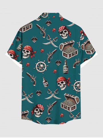 Chemise hawaïenne grande taille avec imprimé tête de mort, bateau pirate, gouvernail, pistolet, couteau, croisière, boutons, poche, pour homme - Vert Profond - L