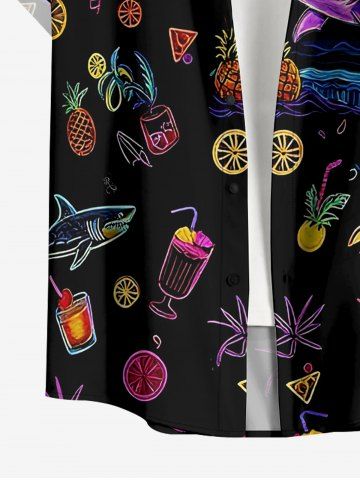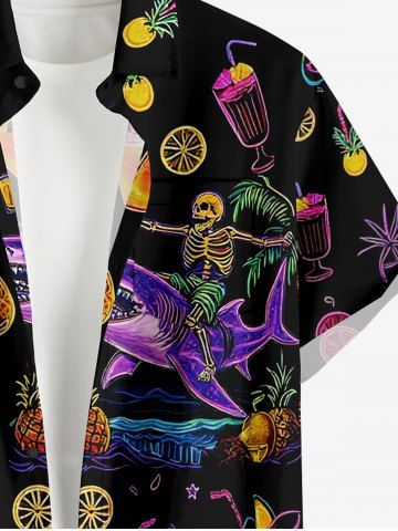Chemise hawaïenne grande taille pour homme, à boutons et poche, avec imprimé ananas squelette, jus de fruits et cocotier. Motif : squelette d'ananas, jus de fruits et noix de coco. - Noir - Noir