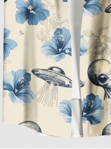 Chemise hawaïenne grande taille pour homme, à boutons et poche, avec imprimé extraterrestre et fleurs d'hibiscus, fleurs d'hibiscus et fleurs extraterrestres. - Bleu Clair - Bleu Clair