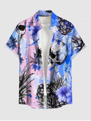 Chemise à Manches Courts> Chemise hawaïenne grande taille pour homme, à boutons et poche, ornée d'un imprimé tête de mort, hibiscus, ananas et éclaboussures de peinture. Motif tête de mort, hibiscus et ananas.