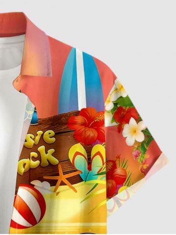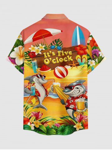 Chemise hawaïenne grande taille pour homme, à boutons et poches, avec imprimé hibiscus, requins, jus de fruits et pastèque. Motifs : fleurs d'hibiscus, requins et pastèque. - Orange - Orange